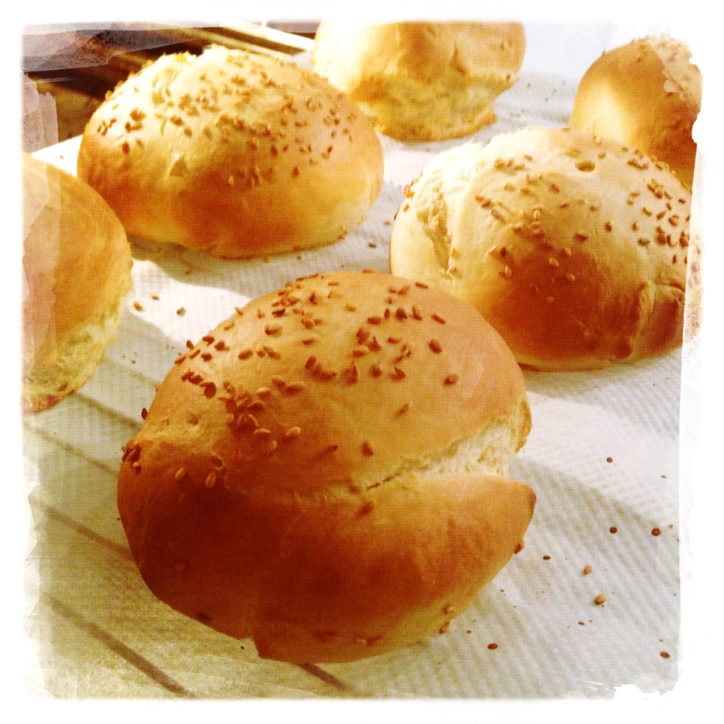 Et maintenant? Mélangez la farine, le sel, le sucre et la levure. Ajoutez ensuite le lait tiède, l’eau et le beurre fondu. Mélangez les deux préparations puis ajoutez l’oeuf. Pétrissez longuement jusqu’à obtenir une boule ferme et non collante. Couvrez d’une serviette et laissez reposer une heure.  Ensuite, façonnez vos boules de pâte, dorez avec un pinceau trempé dans du lait puis garnissez de graines de sésame. Laissez reposer 30 minutes. Enfournez ensuite à 180°C durant 20 minutes.