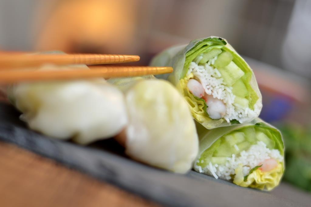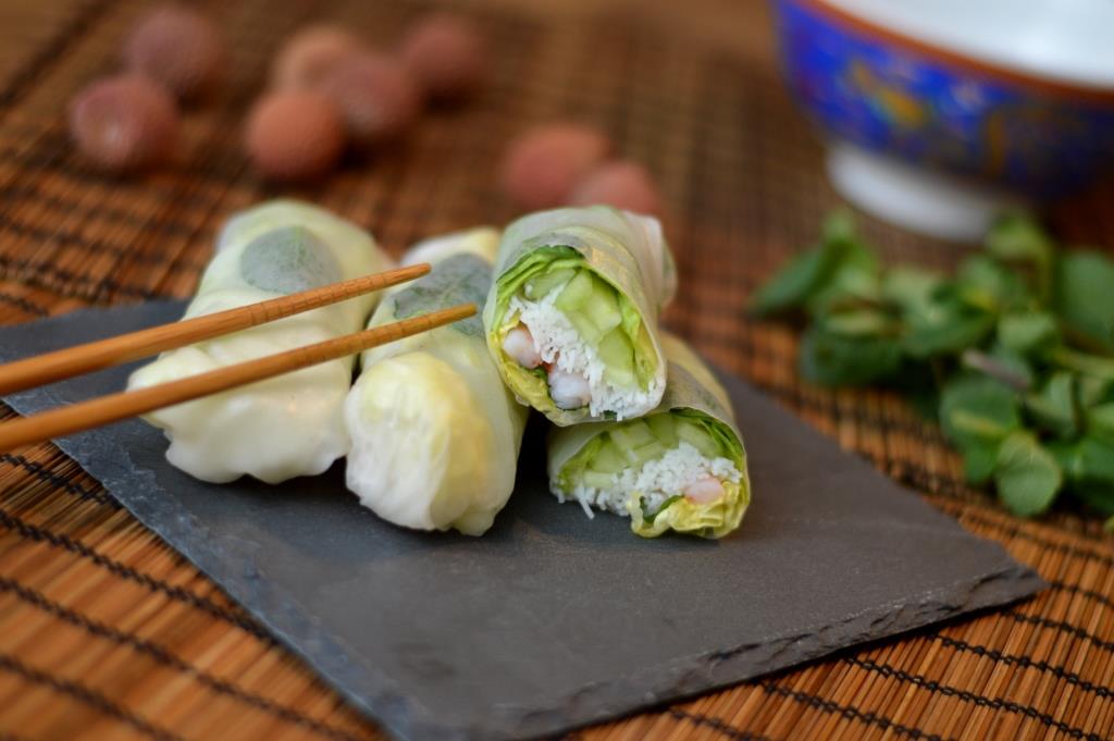 Et maintenant? Commencez par éplucher votre concombre puis coupez-le en fins bâtonnets. Faites cuire vos vermicelles et laissez les refroidir, puis décortiquez vos crevettes. Le montage commence: prenez une feuille de riz, humidifiez-la avec de l’eau tiède puis déposez-la sur un torchon sec. Déposez-y une feuille de laitue, des bâtonnets de concombre, quelques vermicelles, 2 à 3 crevettes, de la menthe et une feuille de laitue pour refermer le tout. Enroulez le rouleau sur lui-même: c’est prêt! Réservez au froid et servez avec les sauces traditionnelles d’accompagnement.
