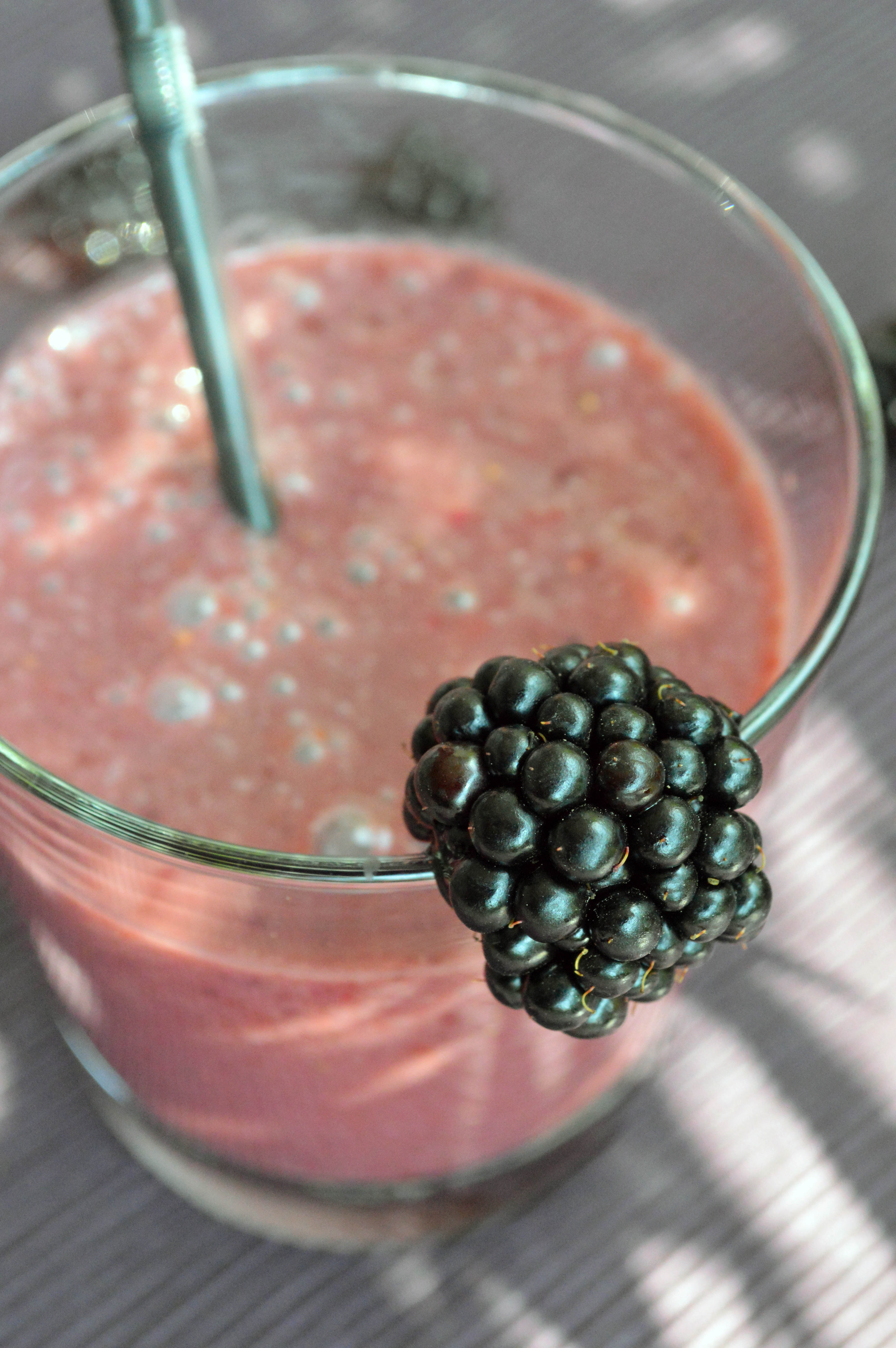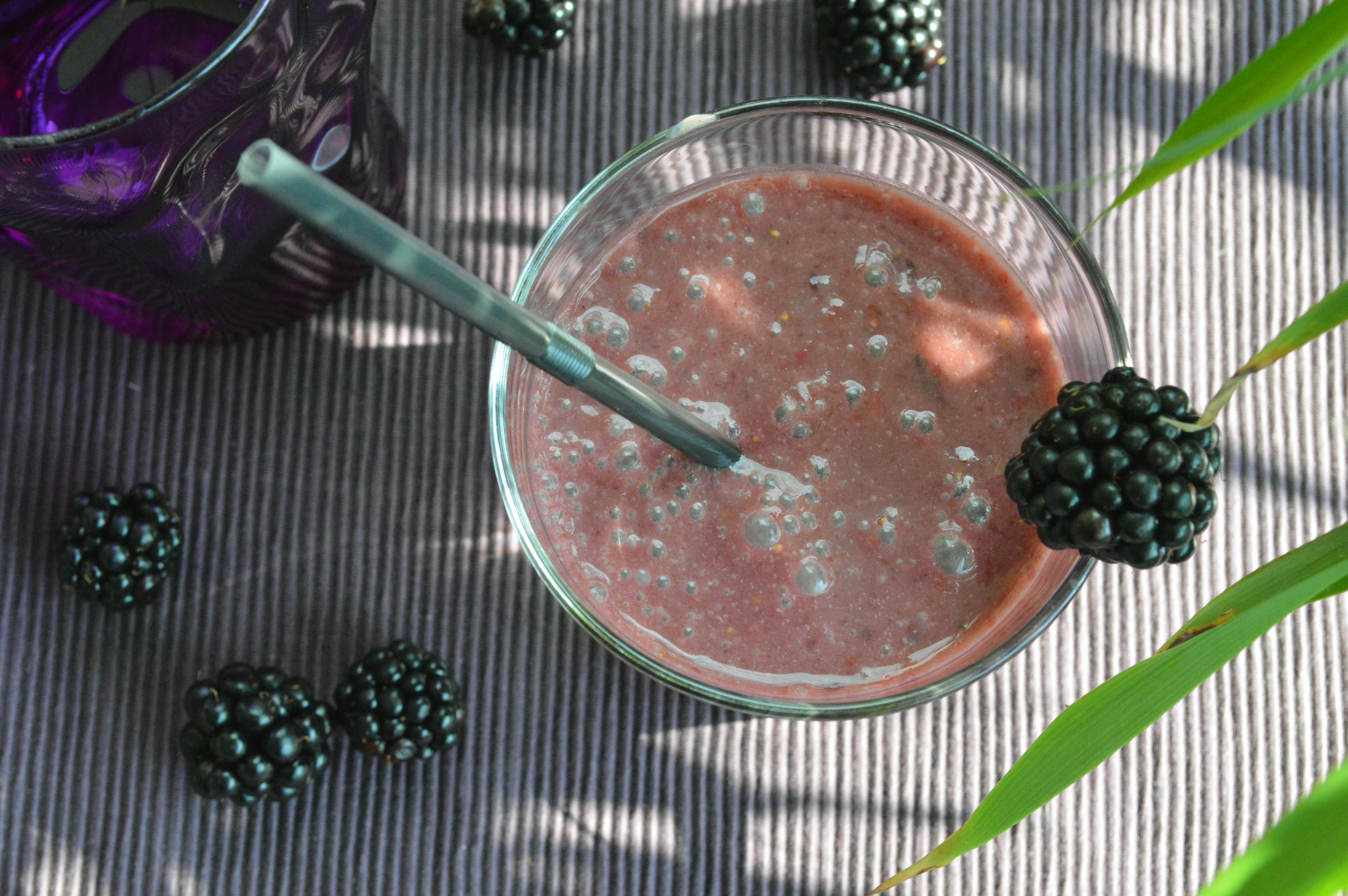 Je ne sais pas vous, mais moi, le soleil, le ciel bleu, le retour des petites robes et les soirées à rallonge me donnent des ailes. Encore plus quand je vois tous les jolis fruits d’été qui sont de retour sur les étals… Je ne pourrais manger que ça ! Et pour varier les plaisirs, j’adore me faire des smoothies 100% fruits à savourer dès le matin… Une douce et saine façon de commencer la journée! Des recettes de ce type, j’en avais déjà proposé quelques-unes, comme le smoothie multifruits ou le smoothie fraises & bananes. Cette fois, j’ai choisi de mélanger les mûres et les fraises qui ont déjà pointé le bout de leur nez sur notre balcon… Et vous, c’est quoi votre smoothie préféré?