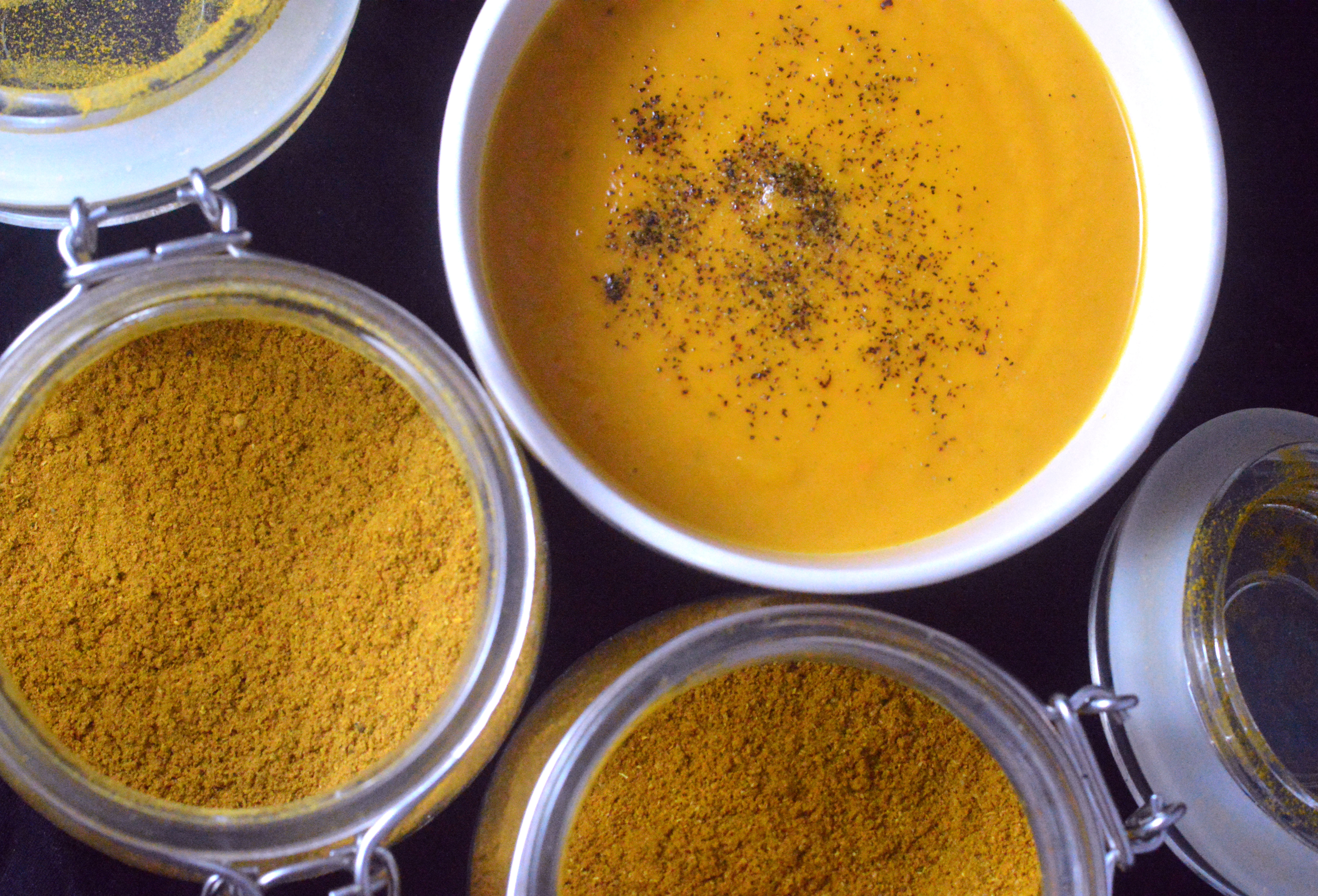Et maintenant? Epluchez et coupez vos légumes puis émincez votre oignon. Dans une casserole, versez un filet d’huile d’olive et faites revenir l’oignon. Ajoutez vos légumes et faites les suer 2 minutes à feu vif. Mouillez avec du bouillon de légumes, de sorte à recouvrir tous vos légumes de liquide. Laissez cuire pendant 30 minutes. Mixez ensuite le tout et ajoutez-y un peu de lait, afin d’obtenir la consistance que vous souhaitez pour votre soupe (environ 40 cl pour moi). Ajoutez ensuite vos épices, je vous conseille d’y aller doucement et de goûter votre soupe au fur et à mesure.