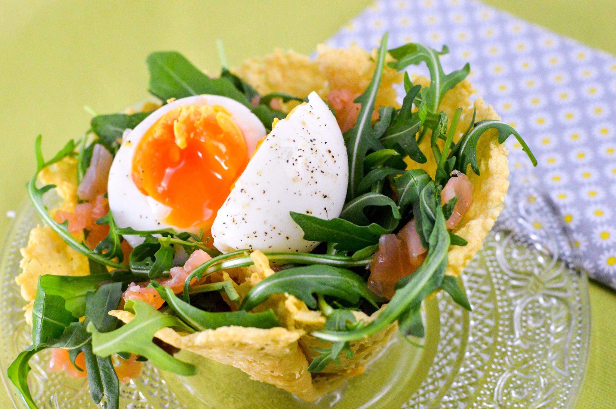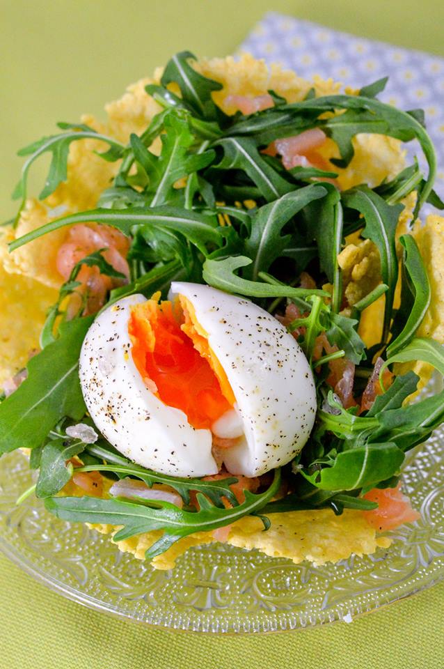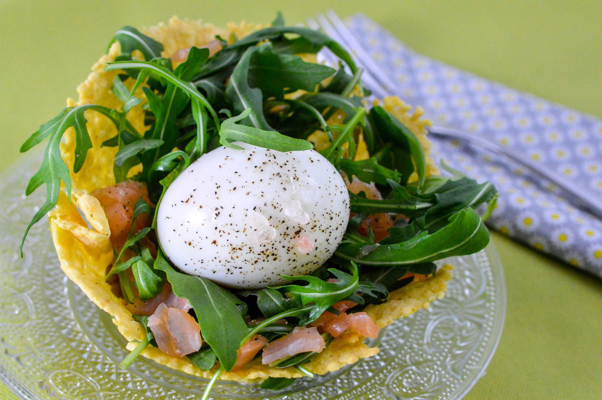 Pour le dressage, je place au fond de mon nid en parmesan un peu de salade de lentilles, je recouvre de roquette et d’un peu de saumon fumé. Et je termine en y déposant mon œuf mollet.