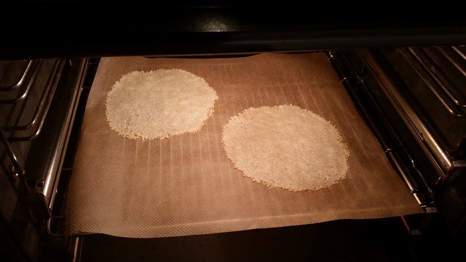 Et maintenant? Pour réaliser mes nids en parmesan, je préchauffe mon four à 200°C. Je forme deux ronds de parmesan râpé sur une feuille de papier sulfurisé et j’enfourne durant 5 minutes. Quand les bords de mes cercles commencent à brunir légèrement, je sors mes disques et les place dans une tasse pour former le nid.