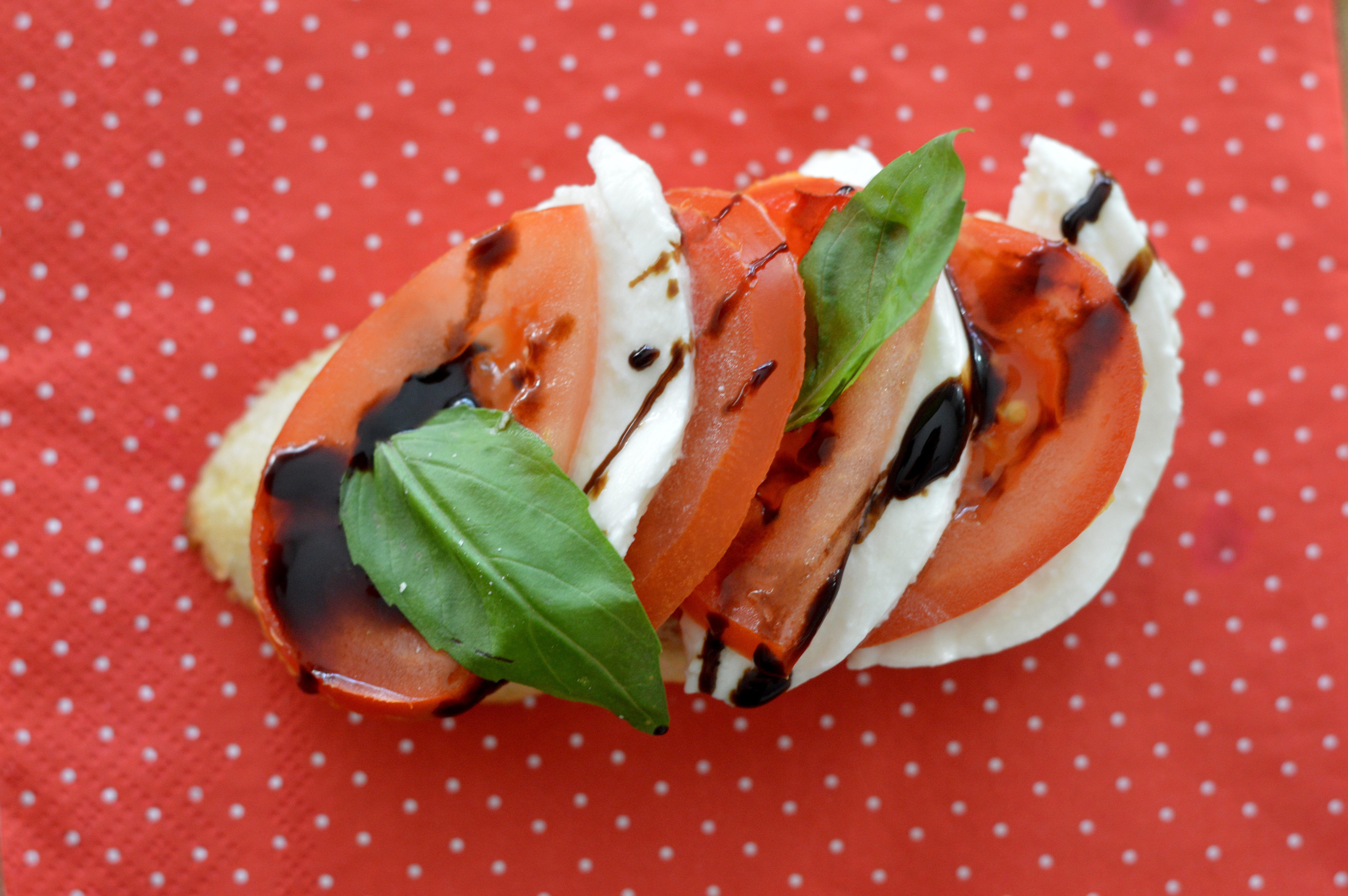 Et maintenant? Enduisez votre pain d’huile d’olive, puis toastez-le. Découpez vos tomates et votre mozzarella en rondelles fines. Recouvrez votre tapas en alternant une tranche de tomate, une tranche de fromage. Terminez avec la crème de balsamique et le basilic.
