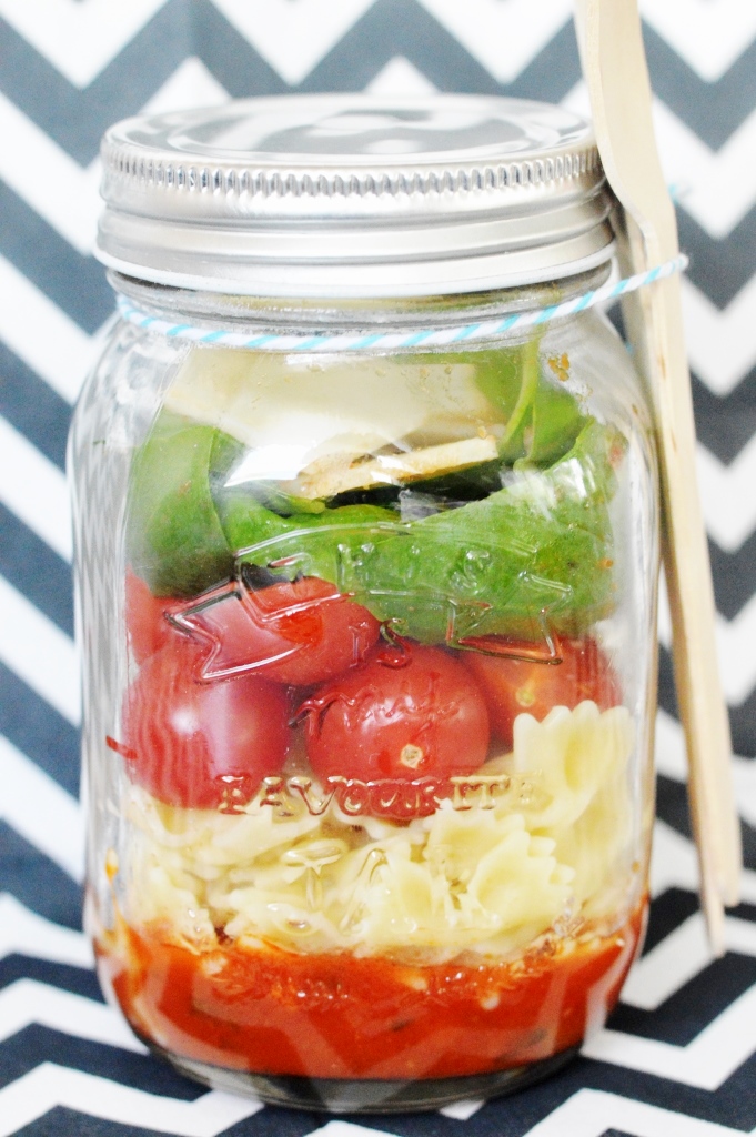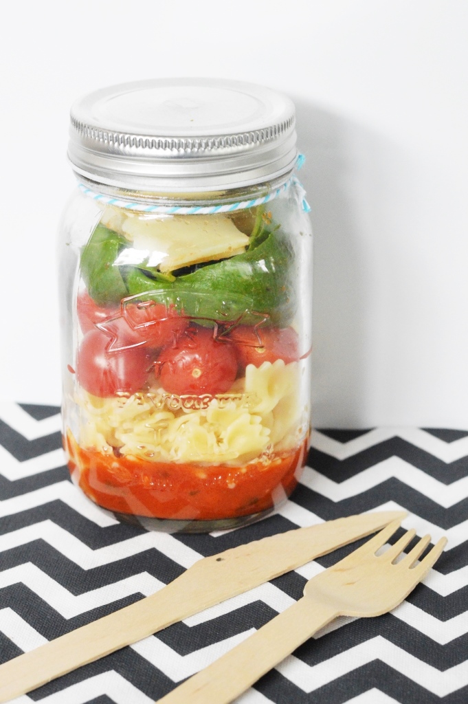 Et maintenant? Faites cuire, puis refroidir vos pâtes. Au fond du bocal, commencez par verser un peu de sauce tomate. Ensuite, ajoutez dans l’ordre: une couche de pâte, de tomates cerises, de basilic et de parmesan. Fermez le bocal et conservez au frais.