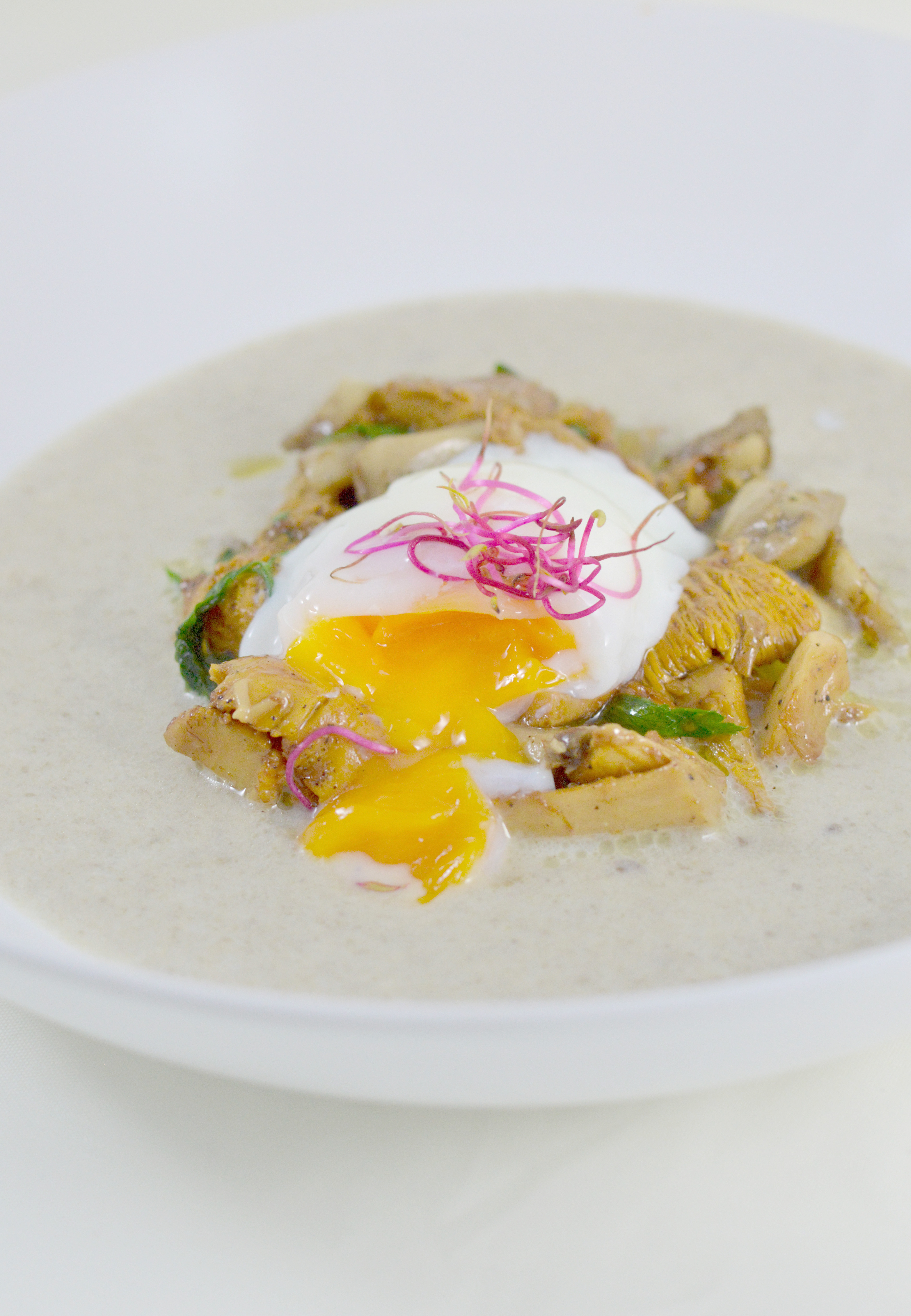 Place au montage. Dans une assiette, déposez deux louches de velouté. Au centre, formez un nid avec la poêlée de champignons et déposez dessus l’oeuf parfait (que vous sortirez de sa coquille au tout dernier moment). J’ai ajouté quelques pousses de betteraves pour la couleur, mais vous pouvez vous servir d’un peu de persil hâchée, ce sera tout aussi joli.