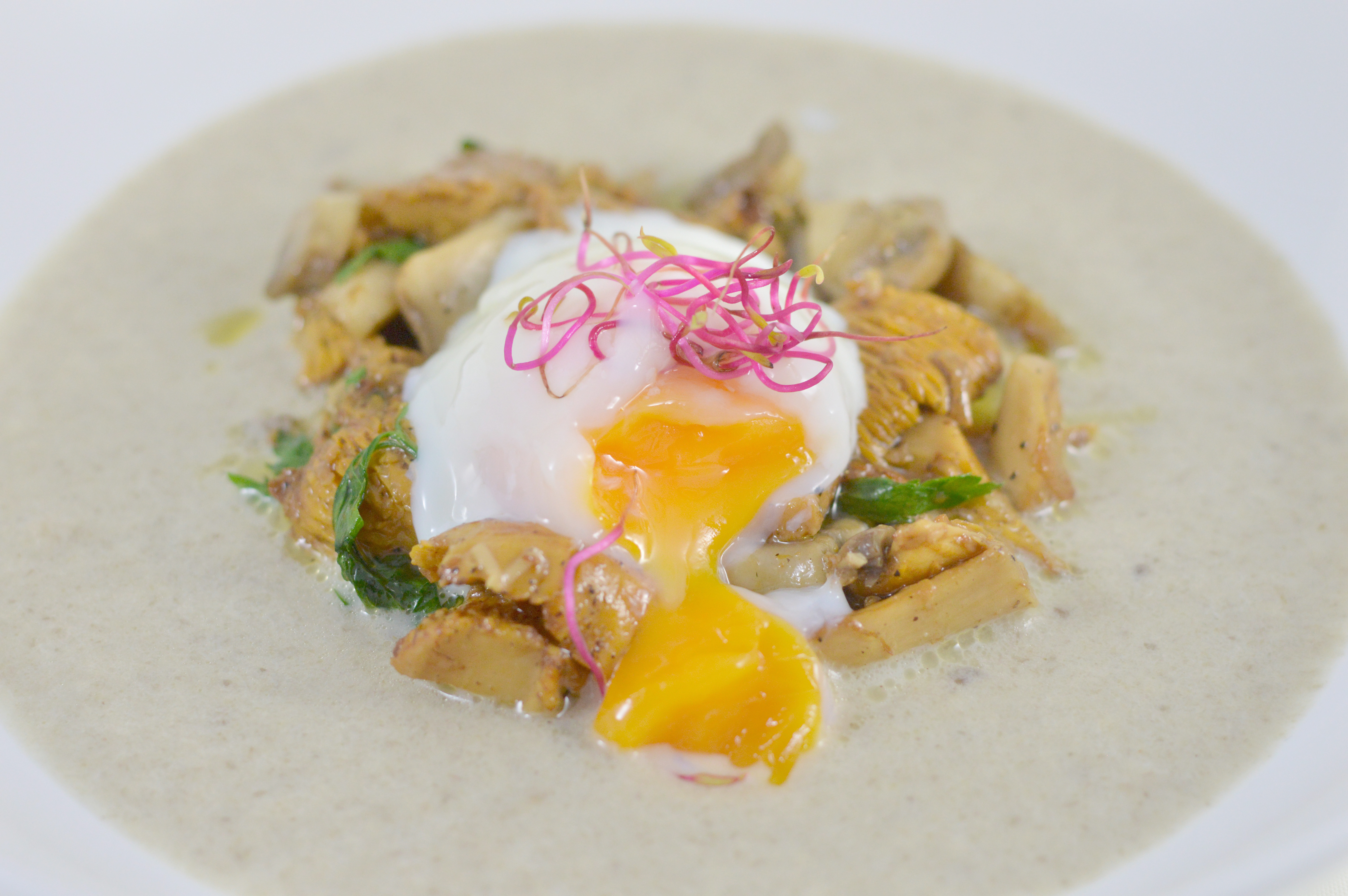 Pour la crème de champignons, faites revenir une gousse d’ail et les champignons des bois dans de l’huile d’olive 4-5 minutes. Ajoutez le bouillon de poule et laissez mijoter 5 minutes. Quand les champignons sont mous, mixez le tout et terminez avec la crème. Attention à ne pas faire un velouté trop liquide, adaptez si besoin les quantités de bouillon et de crème pour obtenir quelque chose d’onctueux. Salez, poivrez.