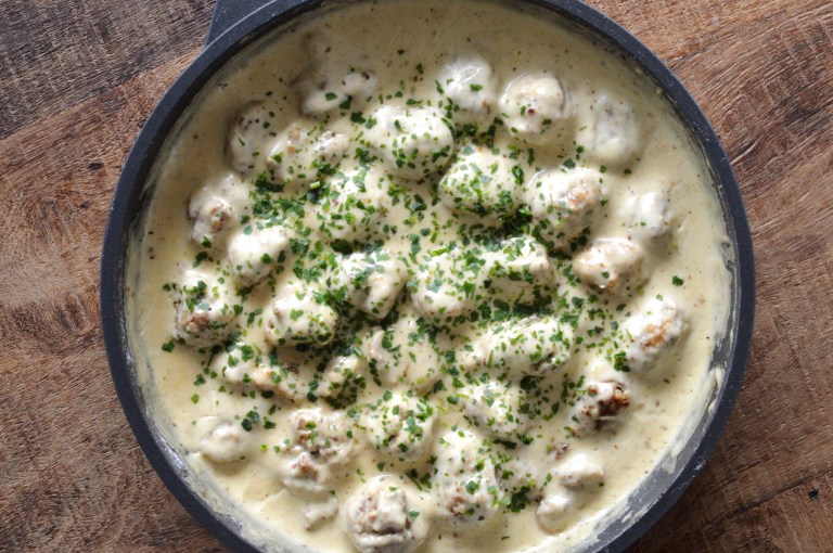 Dans la même poêle ayant servi à la cuisson de vos boulettes, préparez votre sauce, après avoir ôter le surplus de gras issu de la cuisson de la viande. Faites fondre le beurre et ajoutez la farine. À l’aide d’un fouet, mélangez jusqu’à l’obtention d’une pâte. Laissez cuire pendant quelques secondes puis versez le bouillon de poulet en fouettant continuellement. Assaisonnez puis versez le reste des ingrédients nécessaires à la sauce. Ajoutez enfin vos boulettes, portez à ébullition puis laissez mijoter à feu moyen pendant une dizaine de minutes.