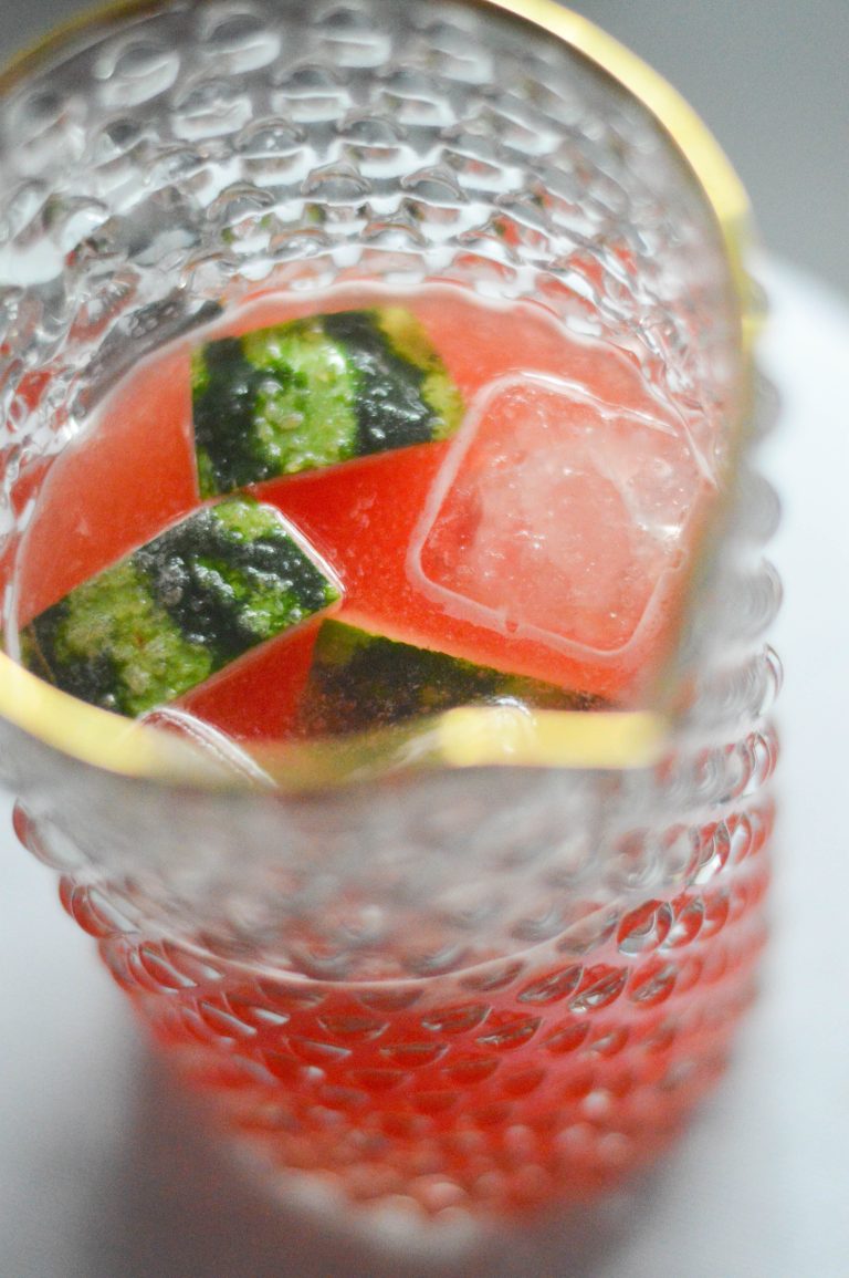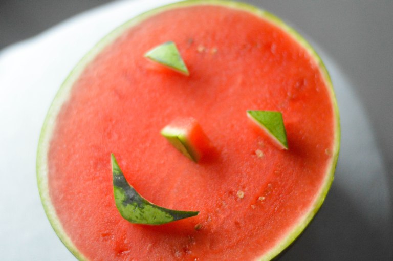Et maintenant? Découpez votre morceau de pastèque pour n’en garder que la chair. Mixez-la avec l’eau dans un blender et versez le tout dans une carafe, à travers une petite passoire histoire de retirer les petits éclats de pépins. Ajoutez quelques morceaux de pastèques avec peau et chair dans la carafe ainsi que des glaçons. Servez bien frais !