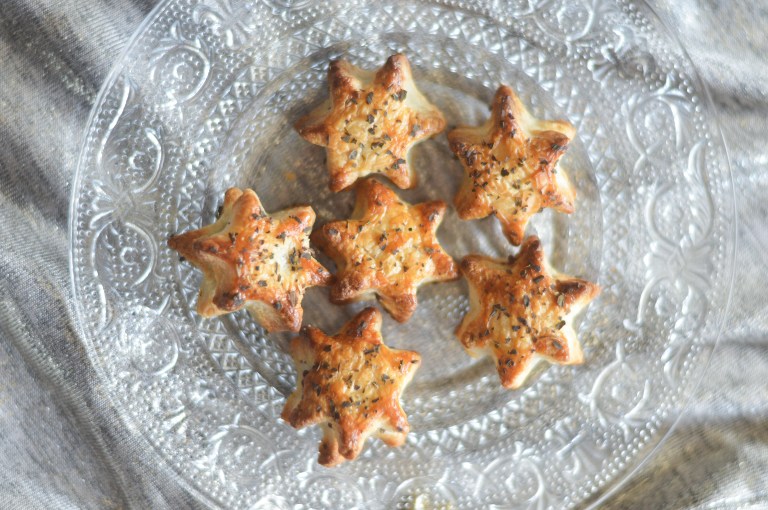 Et maintenant? Préchauffez votre four sur 180. Emporte-piècez des étoiles dans votre pâte feuilletée. Garnir une étoile sur deux avec votre garniture – j’ai choisi la moutarde ancienne – puis refermet vos étoiles en posant l’étoile non garnie sur l’étoile garnie. Passez un peu de jaune ‘oeuf sur chacune d’elles à l’aide d’un pinceau et saupoudrez d’origan. Enfournez 10-15 minutes.