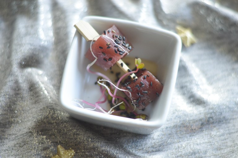 Et maintenant? Détaillez des cubes de thon rouge, les monter en brochette et les arroser d’un peu d’huile de sésame, de grains de sésame et de jeunes pousses.
