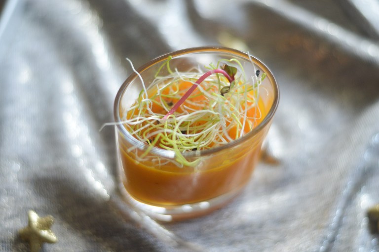 Et maintenant ? Faites revenir l’oignon dans un peu d’huile d’olive puis ajouter le potimarron grossièrement coupé avec sa peau (oui oui, avec sa peau). Arrosez de bouillon jusqu’à recouvrir le tout puis laisser cuire jusqu’à ce que le potimarron soit mou. Mixez le tout et assaisonnez avec le gingembre, le sel et le poivre. Servir en verrine avec quelques jeunes pousses en guise de décoration.