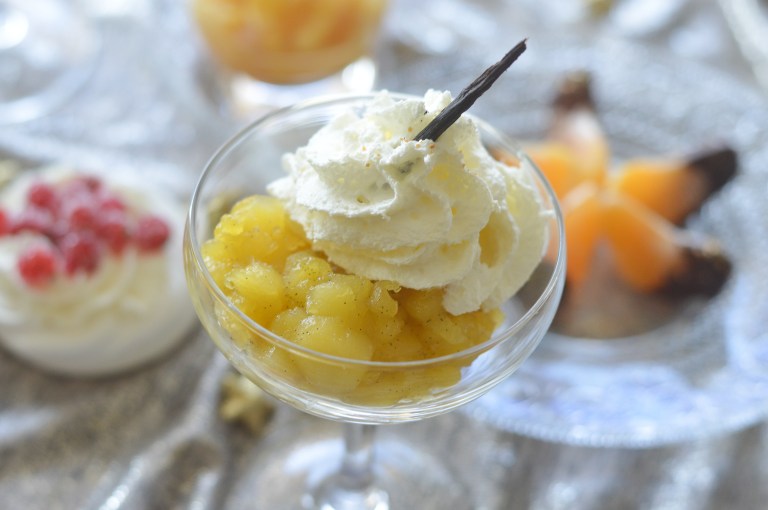 Et maintenant ? Epluchez et coupez les pommes en petits morceaux. Dans une casserole, faire fondre le beurre puis faire venir les pommes. Déglacez au Calvados. Ajoutez le sucre, la vanille et laissez cuire jusqu’à ce que les pommes soient caramélisées et molles. Dressez les pommes tièdes dans des coupes avec un peu de chantilly.