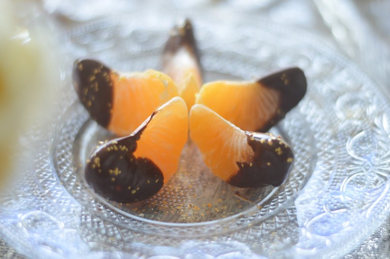 Et maintenant ? Pelez vos clémentines. Faites fondre votre chocolat avec le beurre au bain marie. Trempez chaque quartier de clémentine dans le chocolat et laisser refroidir sur une feuille de papier sulfurisé. Décorez le tout avec quelques paillettes alimentaires dorées.