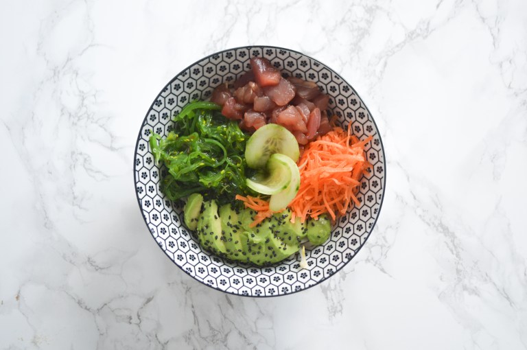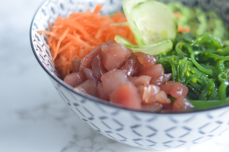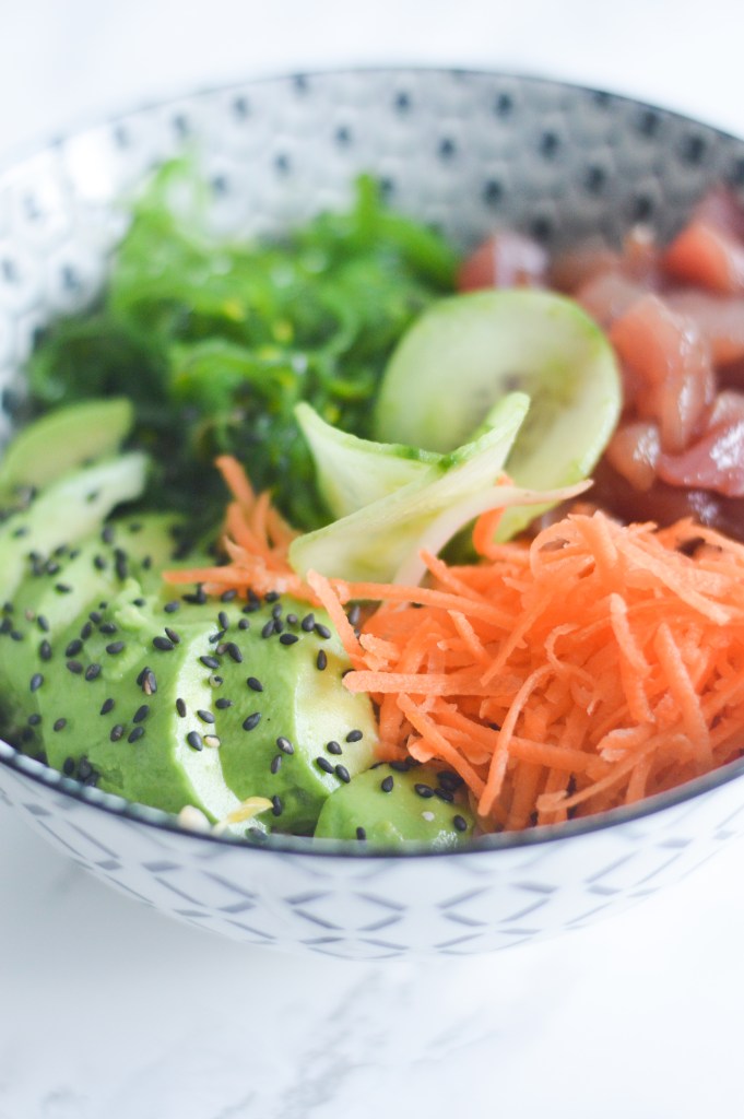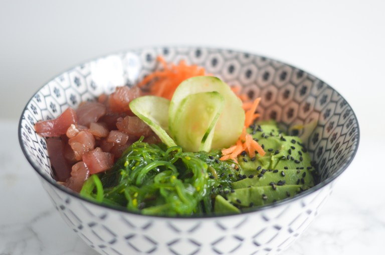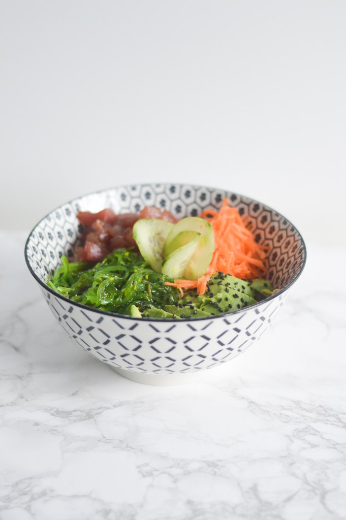 Mon truc du moment – depuis un bon moment d’ailleurs – c’est le Poke Bowl. En gros, un bol remplis de divers aliments bons pour la santé, inspiré de la cuisine hawaïenne et donc essentiellement composé de poisson cru. Je vous propose pour cette première un Poke Bowl à base de thon, d’avocat, de pousses de soja, de boulghour, de carottes, de concombre et de wakamé, ces algues dont je raffole complètement. Bien sûr, libre à vous de changer certains ingrédients selon vos préférences !