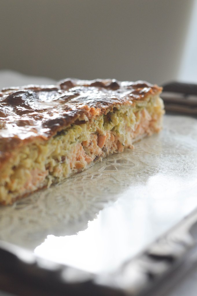 J’adore cette recette de tourte saumon-poireaux, inspirée de celle que me fait souvent ma grand-mère. En général, elle présente la sienne sous forme de roulé feuilleté, moi j’ai choisi d’en faire une sorte de gâteau… J’y ai aussi ajouté plein d’aneth parce que j’adore ça. C’est une recette que vous pouvez préparer un peu à l’avance et enfourner ou réchauffer à la dernière minute, très pratique donc. Accompagnée d’une salade et d’une vinaigrette acidulée, vous allez vous régaler, promis !