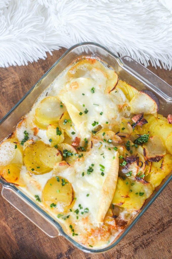 Peut-être que vous êtes au ski, à la montagne, tout juste revenu d’une virée en raquettes, ou que vous rêvez de ces paysages tout blancs depuis votre canapé ? Moi je dois dire que je rêve plutôt de soleil et de piscine vue sur mer… d’ailleurs, dites moi en commentaires si vous êtes #teamski ou #teamplage… En tout cas, j’avoue qu’avec cet hiver à rallonge, la cuisine montagnarde me fait de l’oeil ! Ni une ni deux, j’ai concocté une petite tartiflette express pour une soirée ambiance chalet feu de cheminée et plaid en fourrure… Vous voyez le tableau ? Voici ma recette.
