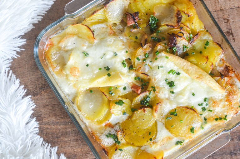 Et maintenant? Epluchez et coupez vos pommes de terre en lamelle. Faites les cuire 8 minutes au micro-ondes avec 3 c. à soupe d’eau, en mettant le tout dans un saladier fermé hermétiquement avec du papier transparent. Pendant ce temps, émincez vos oignons et coupez vos lardons. Faites revenir l’oignon et les lardons dans une poêle. Déglacez au vin blanc. Mélangez le tout à vos pommes de terre, salez et poivrez.