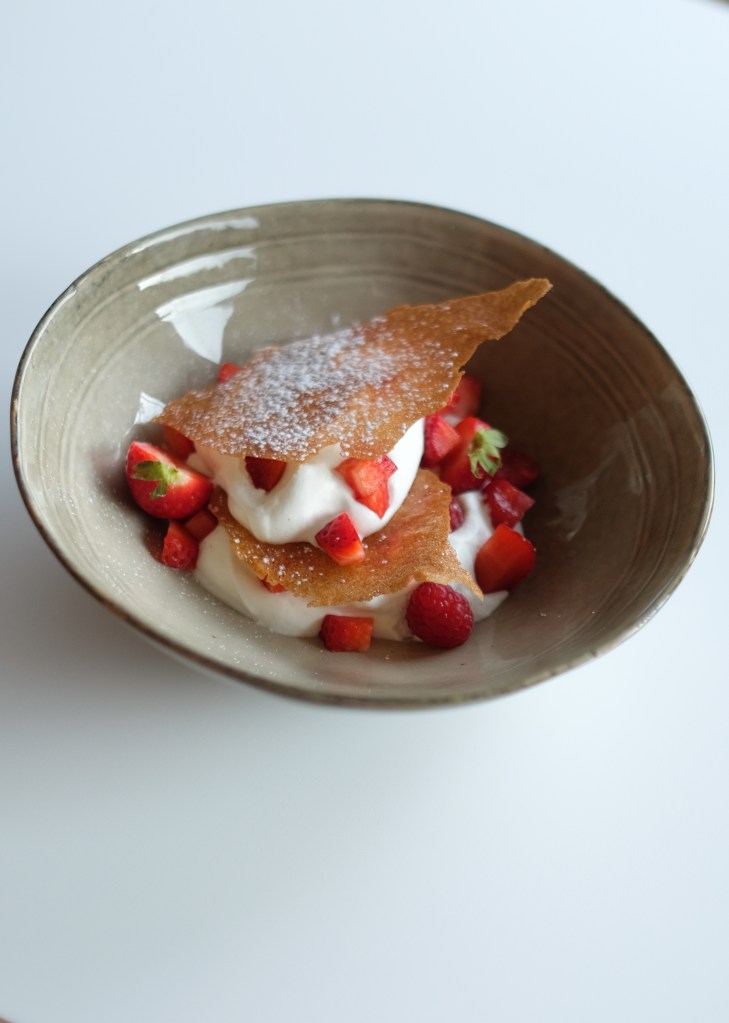 Dressez : une cuillère de crème légère vanillée, des morceaux de fruits rouges, un morceau de feuille de brick croustillant et ainsi de suite…