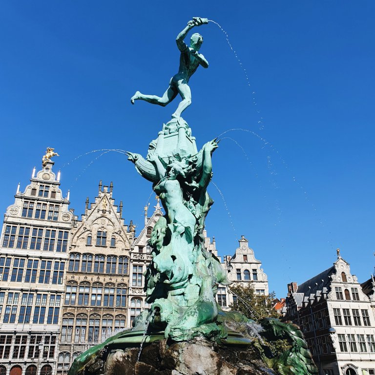 Retour au centre, au départ de la Grand Place, de son hôtel de ville et la statue Brabo. Elle fait référence à la légende qui entoure la ville : Druon Antigone exigeait un droit de passage sur l’Escaut – fleuve qui traverse la ville pour se jeter dans la mer du Nord – et tranchait la main des mauvais payeurs. Brabo tua le géant, lui trancha la main et la jeta dans le fleuve. Suivant cette explication le nom Antwerpen (néerlandais d’Anvers) viendrait de hand werpen (hand = la main, werpen = jeter, en néerlandais). C’est aussi pour cela que l’on vend, partout à Anvers, des chocolats et des biscuits en forme de main.