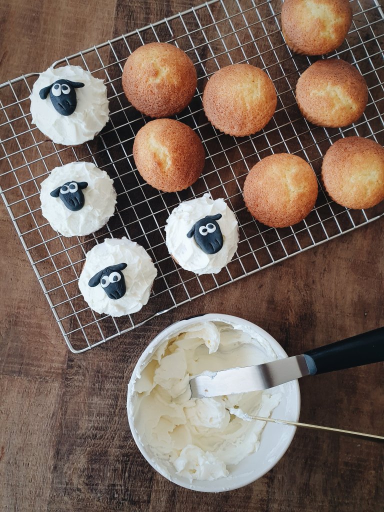 Dressez vos muffins une fois refroidis, avec un peu de glaçage et une tête de mouton.