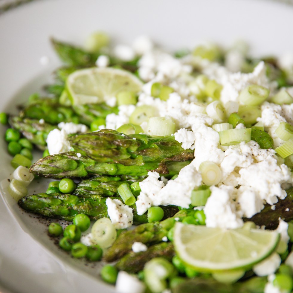 Salade tiède d’asperges rôties & petits pois, vinaigrette citron